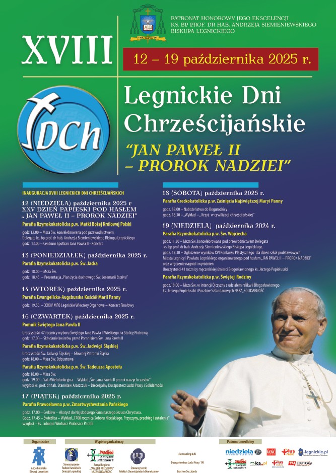 W dniach 12–19 października w Legnicy odbędą się XVIII Legnickie Dni Chrześcijańskie, nad którymi patronat honorowy objął biskup legnicki ks. bp prof. dr hab. Andrzej Siemieniewski. Tegoroczne wydarzenia organizowane są pod hasłem „Jan Paweł II – Prorok Nadziei”.