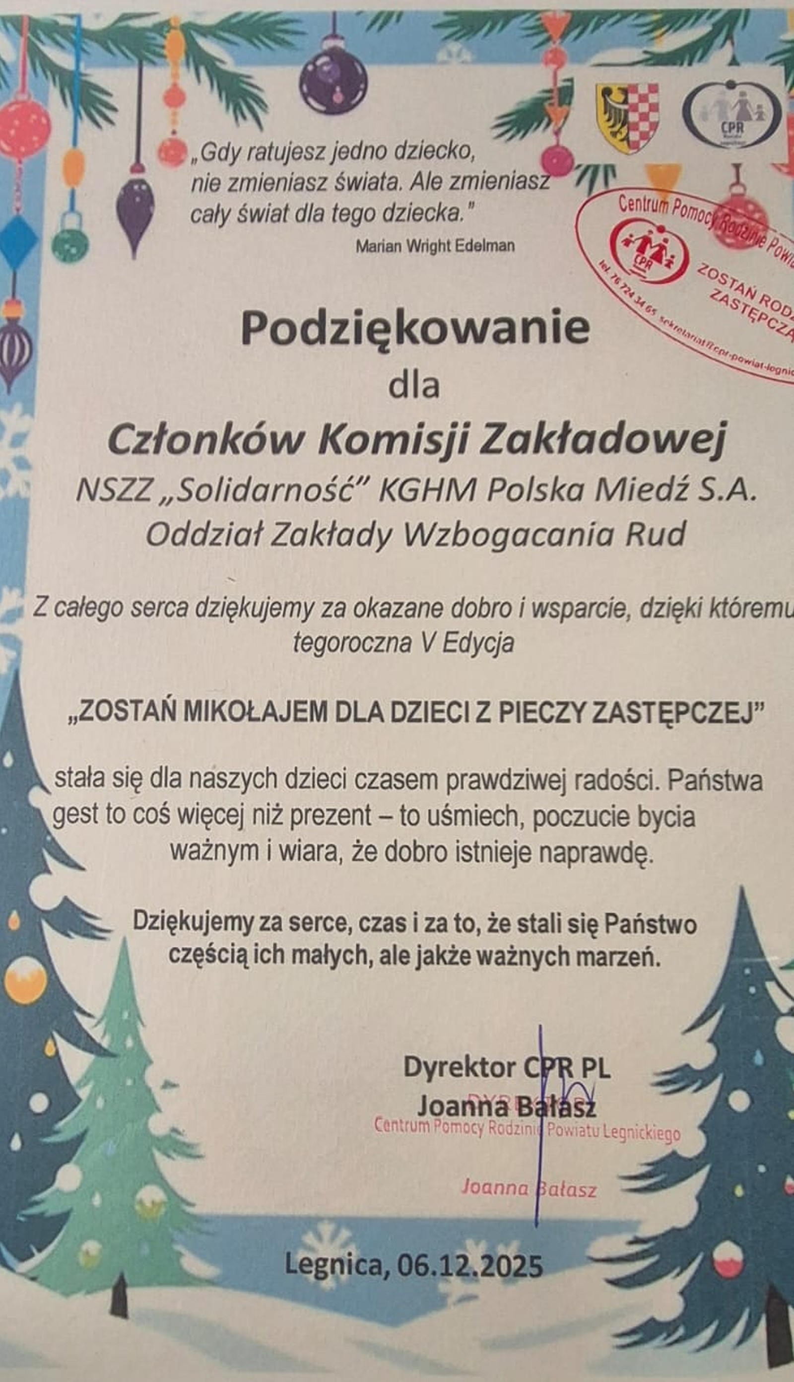 Komisja Zakładowa NSZZ „Solidarność” KGHM Polska Miedź S.A. O/ZWR w Polkowicach zakończyła świąteczną akcję „Paczka dla Dzieci z Rodzin Zastępczych”, w ramach której przygotowano i przekazano dzieciom okolicznościowe paczki świąteczne. Dzięki zaangażowaniu związkowców, pracowników i ludzi dobrej woli najmłodsi otrzymali wymarzone zabawki, ciepłe ubrania i słodkości, które sprawiły, że ich Mikołajki były naprawdę wyjątkowe. Organizatorzy podkreślają, że to dowód na to, iż solidarność wykracza poza sprawy pracownicze i dociera tam, gdzie wsparcie jest najbardziej potrzebne.