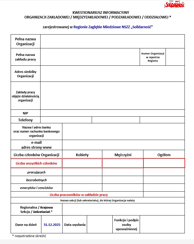 Zgodnie z Uchwałą Komisji Krajowej nr 13/10, należy przesłać do Regionu ankietę statystyczną ze stanem na ostatni dzień półrocza (31 grudnia 2025), w terminie do 15. dnia miesiąca następującego po zakończeniu półrocza.