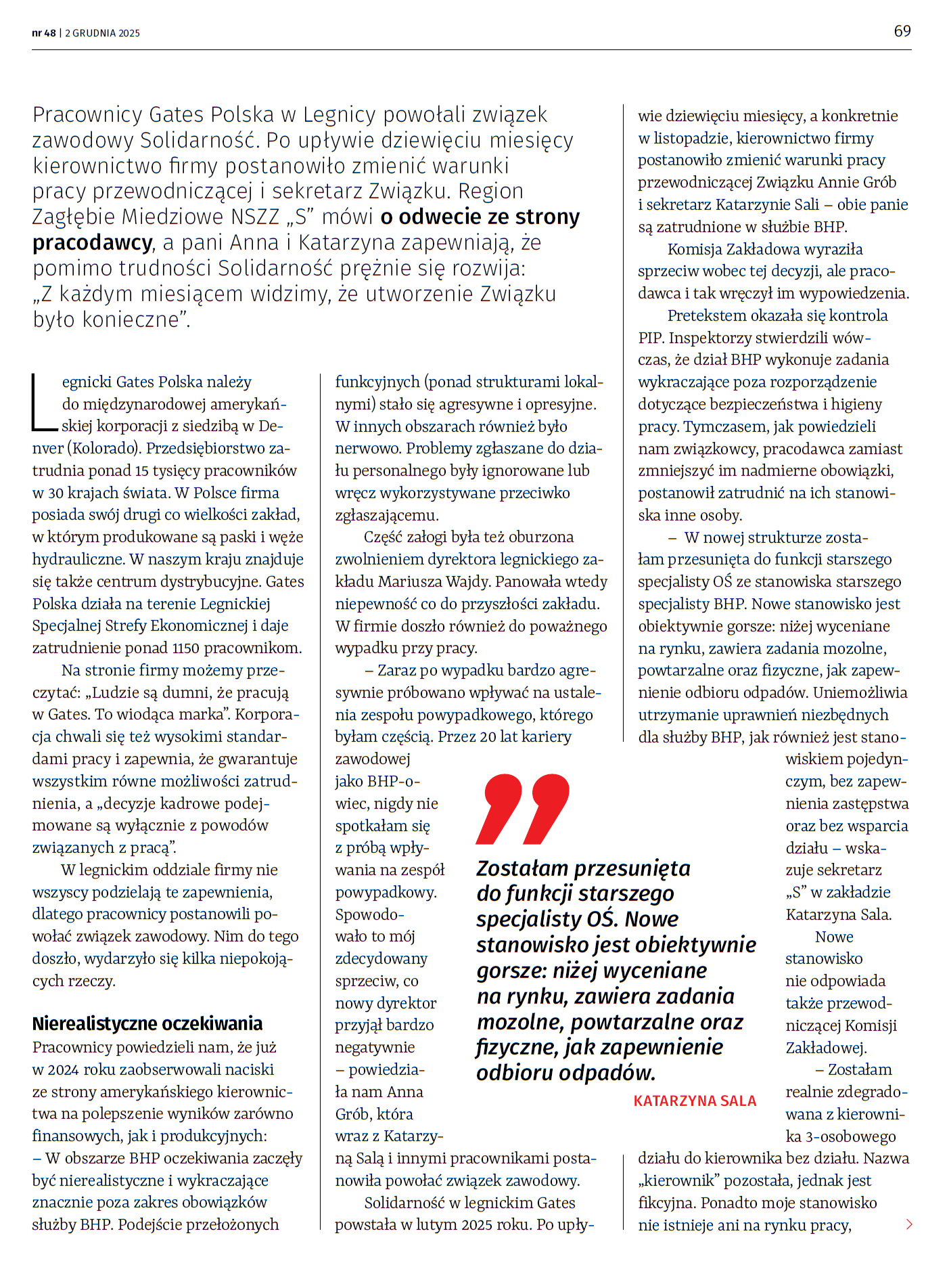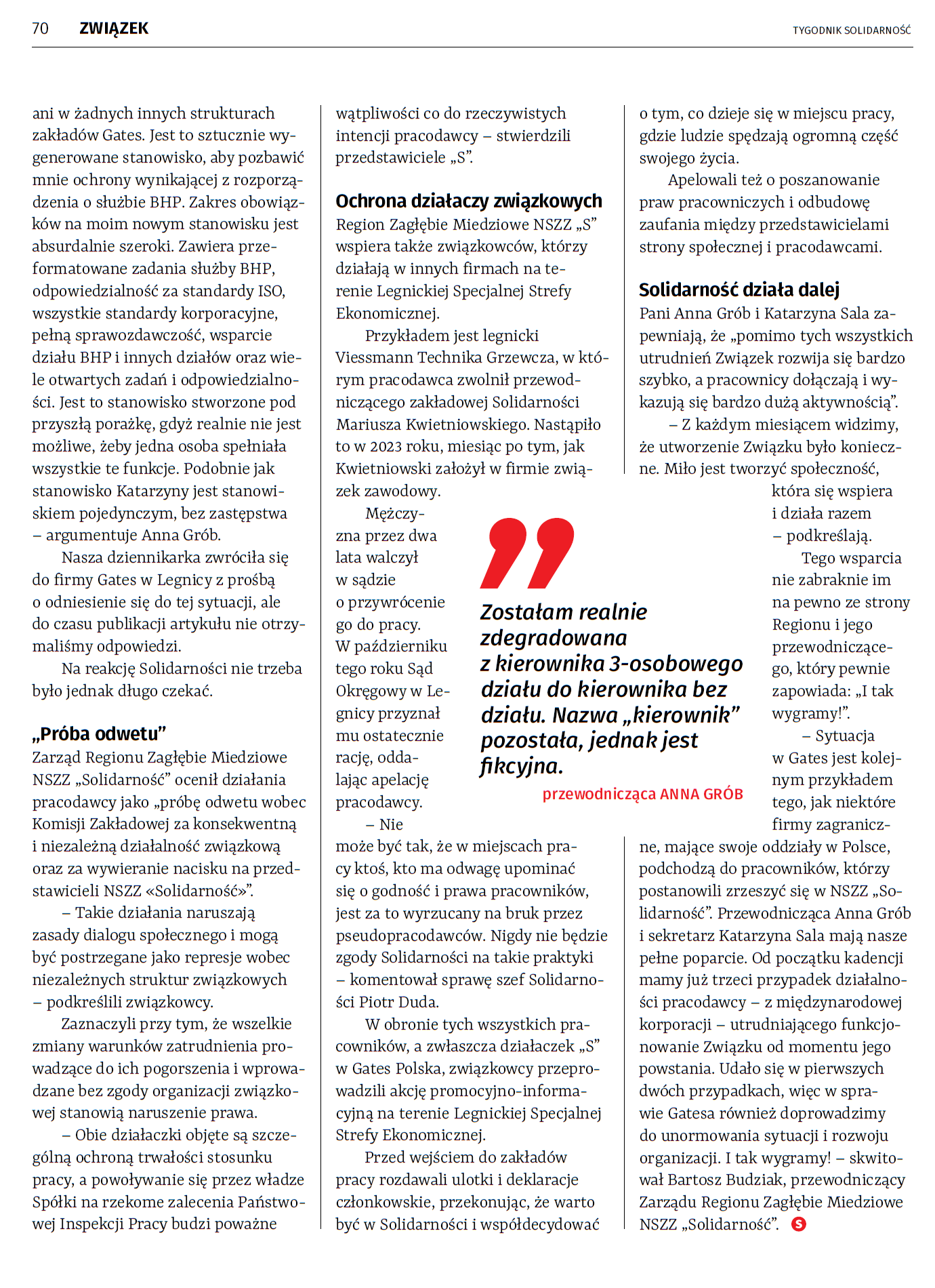 W numerze 48 Tygodnik Solidarność publikuje tekst Marcina Krzeszowca „I tak wygramy” opisujący działania pracodawcy w Gates wobec związkowczyń Anny Grób przewodniczącej oraz Katarzyny Sali sekretarz KZ NSZZ „Soldiarność” w Gates Polska w Legnicy.