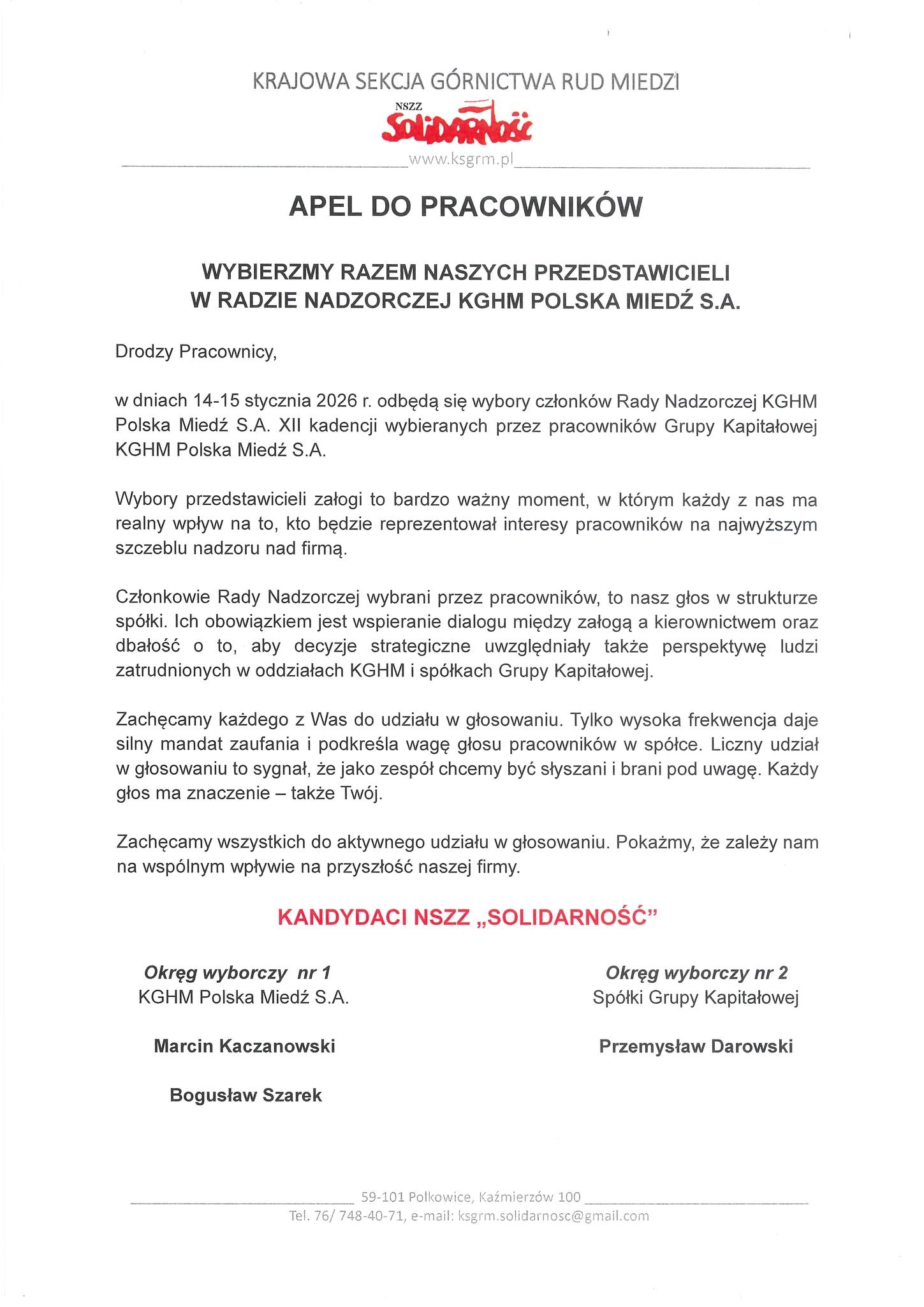 w dniach 14–15 stycznia 2026 r. odbędą się wybory członków Rady Nadzorczej KGHM Polska Miedź S.A. XII kadencji wybieranych przez pracowników Grupy Kapitałowej KGHM Polska Miedź S.A.