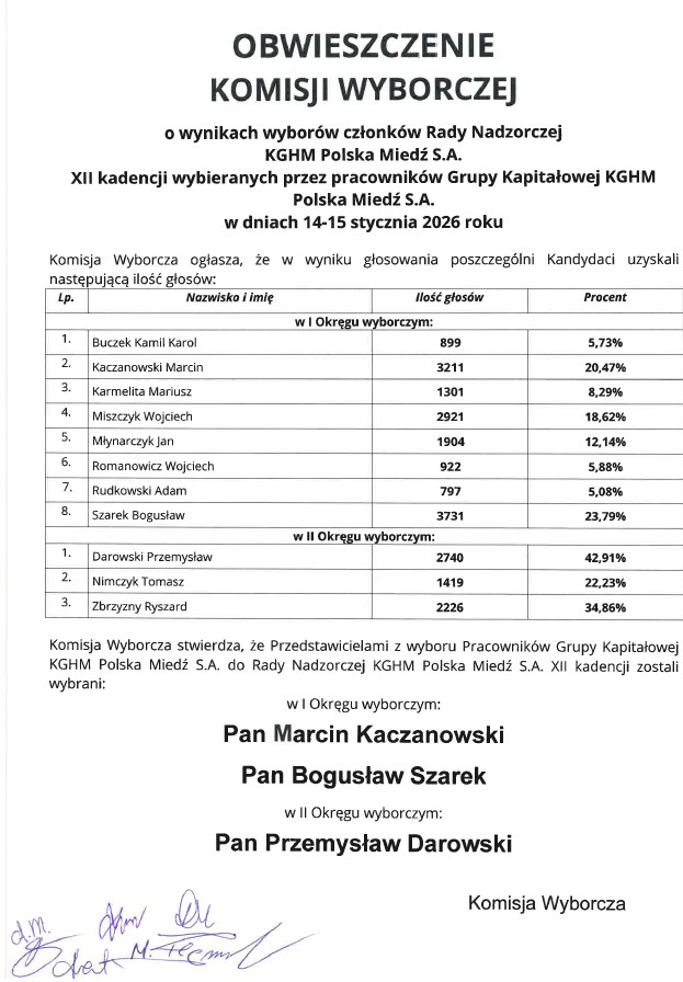 W I okręgu wyborczym zaufanie pracowników zdobyli Marcin Kaczanowski oraz Bogusław Szarek, natomiast w II okręgu wyborczym mandat uzyskał Przemysław Darowski. Wszyscy trzej wybrani członkowie Rady Nadzorczej byli kandydatami NSZZ „Solidarność”.