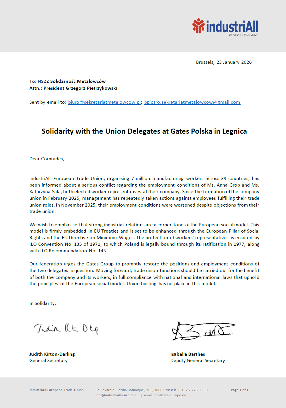 Międzynarodowa Federacja Związków Zawodowych industriAll European Trade Union, zrzeszająca ponad 7 milionów pracowników przemysłu w 39 krajach Europy, wyraziła oficjalne poparcie dla przedstawicielek Komisji Zakładowej NSZZ „Solidarność” w Gates Polska w Legnicy – Anny Grób i Katarzyny Sali.