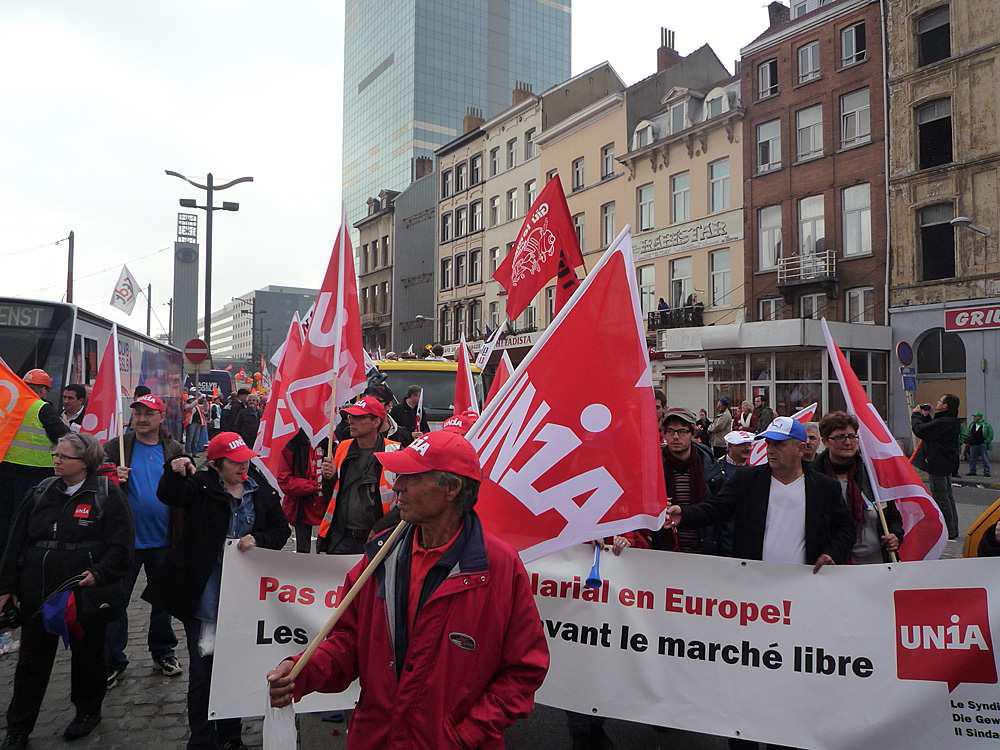 Główna manifestacja odbywała się w Brukseli. Członkowie NSZZ „Solidarność” również uczestniczyli w tej manifestacji. Było nas tam około 100 osób. Przed przemarszem ustawiliśmy się na miejscu zbiórki w okolicach dworca kolejowego Midi. Czuliśmy się bezpiecznie gdyż byli z nami przedstawiciele Związku Zawodowego Policjantów. Z upływem czasu przybywało coraz więcej grup. Podczas oczekiwania na przemarsz związkowcy z Francji urządzili sobie piknik. Po przemówieniach liderów związkowych manifestacja ruszyła. W kolumnie jechała platforma organizacji „UNI Europa”, do której należą związki zawodowe zrzeszające między innymi pracowników banków. NSZZ „Solidarność” jest w UNI afiliowan. Po wyruszeniu na trasę przemarszu od czoła kolumny oddzieliła nas grupa osób wykluczonych i anarchistów. Po przejściu kilkuset metrów razem z manifestantami zostali oni wyprowadzeni przez policję. W innych miejscach przemarszu, grupy osób wykluczonych społecznie i anarchistów wszczynały awantury z policją. Podczas rozmów z koleżankami i kolegami z innych krajów utwierdziliśmy się w tym, że nasz przyjazd do Brukseli był potrzebny. Wyrównywanie poziomu życia a co za tym idzie poziomu wynagrodzeń nie powinien odbywać się w dół jak to się odbywa obecnie ale w górę.