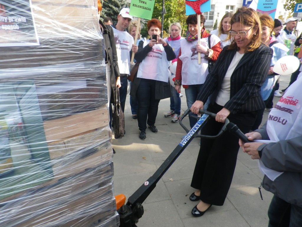 Uczestnicy akcji protestacyjnej złożą w Kancelarii Sejmu petycję zawierającą propozycję zmian legislacyjnych zmierzających do poprawy sytuacji pracowników sieci handlowych. Następnie związkowcy przejdą przed Ministerstwo Pracy i Polityki Społecznej. – Naszą petycję wręczymy również panu ministrowi Kosiniakowi-Kamyszowi. Po drodze sprzed Sejmu do siedziby resortu pracy będziemy tłumaczyć warszawiakom przyczyny naszego protestu. Wszyscy chętni będą też mogli spróbować sił przy rozładunku naszego wózka z towarem. 7 października przypada Światowy Dzień Godnej Pracy. Poprzez nasz protest chcemy zwrócić uwagę, że warunki pracy w handlu nie zawsze są godne – tłumaczy Bujara.