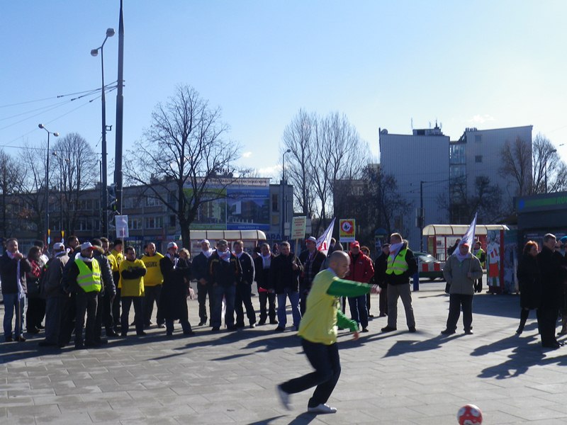 Dlatego związkowcy z handlu rozegrali „dziwny mecz” przed wejściem głównym stadionu. Z jednej strony „kierownik” kopiący piłkę, z drugiej pracownik poganiany do większego zaangażowania się w grę. Całość okraszona bezczelnymi uwagami, jakie często przełożeni wypowiadają wobec swoich podwładnych.