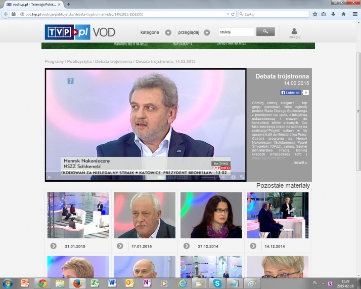 Gośćmi programu "Debata Trójstronna" są Henryk Nakonieczny (Solidarność), Paweł Śmigielski (OPZZ), Janusz Sejmej (Ministerstwo Pracy), Monika Gładoch (Pracodawcy RP) i Zbigniew Żurek (BCC).