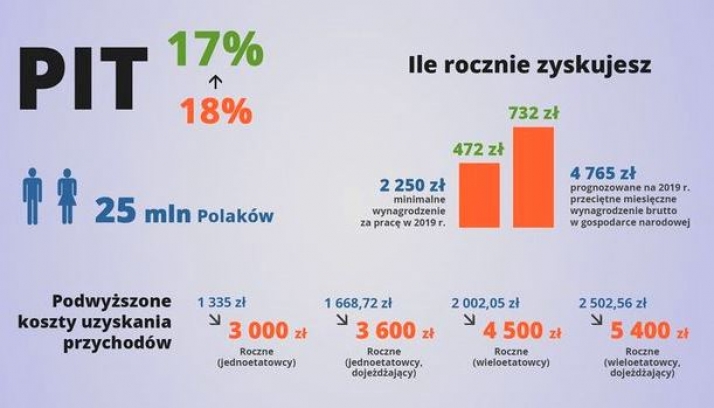 Dzięki obniżce PIT i zwiększeniu kosztów uzyskania przychodów pracownik zarabiający na poziomie płacy minimalnej, czyli 2250 zł brutto, zyska blisko 40 zł na rękę miesięcznie, czyli prawie 480 zł rocznie. Z kolei pracownik osiągający zarobki na poziomie przeciętnego miesięcznego wynagrodzenia w gospodarce narodowej prognozowanego na 2019 rok rok, czyli 4765 zł brutto, zyska rocznie 732 zł netto, czyli przeszło 60 zł miesięcznie na rękę. Zarabiający rocznie na poziomie 85 528 zł, czyli na granicy pierwszego progu podatkowego, co oznacza przeszło 7100 brutto miesięcznie, zyskają na obniżce podatku przeszło 80 zł na rękę miesięcznie, czyli niemal 1000 zł rocznie.