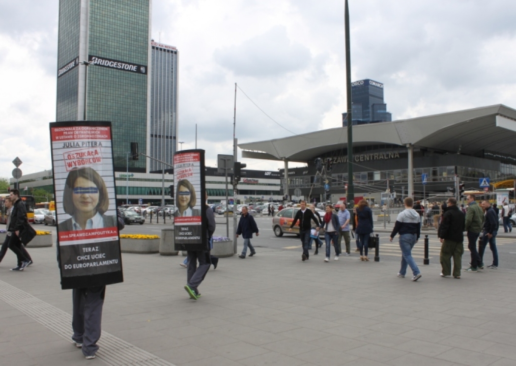 W poniedziałek po południu na ulicach Warszawy pojawiły się 2-osobowe zespoły poruszające się ze specjalnie przygotowanymi banerami z wizerunkiem Julii Pitery. Mimo niesprzyjającej pogody goboardy przemierzały najbardziej ruchliwe stołeczne ulice, budząc zainteresowanie wśród przechodniów.