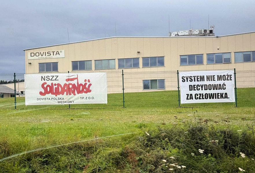 Na ogrodzeniu okalającym „Wioskę Okienną” w Wędkowych koło Tczewa wywieszone zostały 15 września br. związkowe banery i pracownicze hasła m.in. „System nie może decydować za człowieka”. Związkowcy z NSZZ „S” od lipca br. znajdują się w sporze zbiorowym z dyrekcją spółki Dovista Polska. Dotyczy on zmian zapisów w regulaminie pracy.