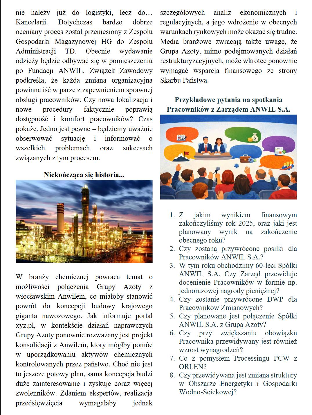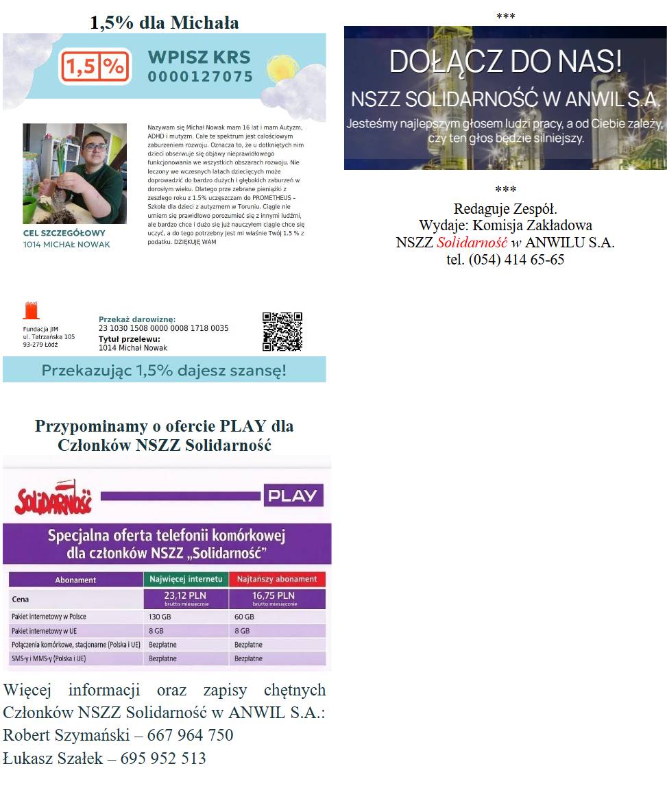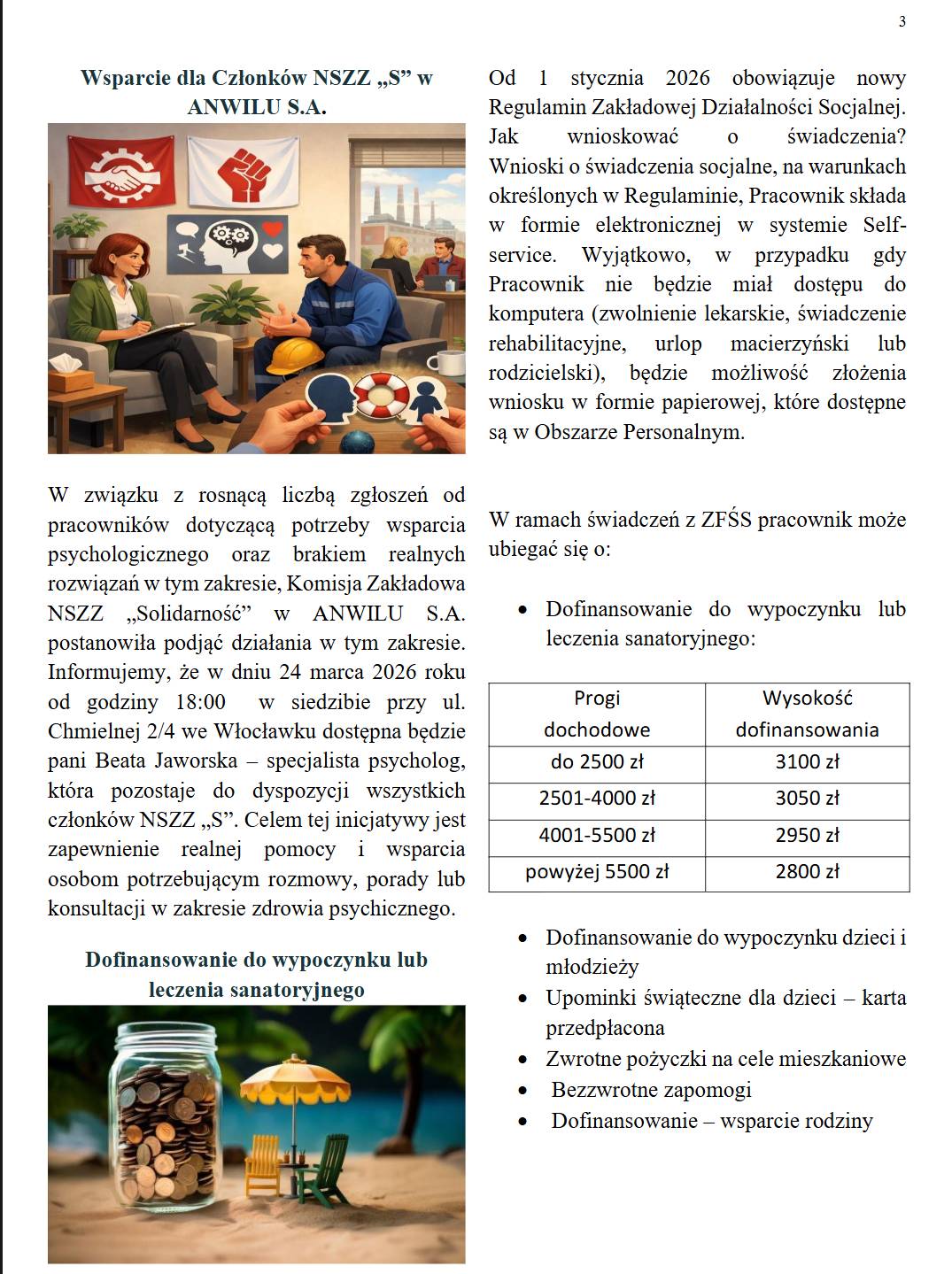 Papierowy biuletyn komisji zakładowej – to dziś zupełny unikat. Ba, także dośc powszechne kiedyś papierowe gazety poszczególnych Zarządów Regionów tez już wychodzą w zaledwie kilku – tych największych. Tymczasem we włocławskim Anwilu komisja zakładowa z powodzeniem wydaje swój biuletyn, w którym informuje o życiu zwiazku i firmy. Można go tez przeczytać wchodzac na https://solidarnosc-anwil.pl/. Dziś publikujemy najnowszy numer, m.in o wsparciu p[sychologicznycm dla członków NSZZ”S”. Zresztą… zobaczcie sami.