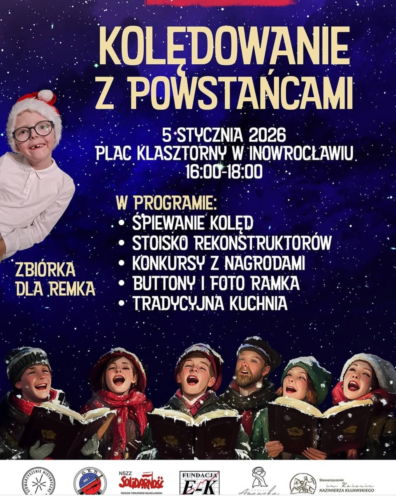 5 stycznia 2026 r. (poniedziałek), w godz. 16:00 – 18:00 zapraszamy na pl. Klasztorny przed Teatrem Miejskim w Inowrocławiu na wspólne kolędowanie z Powstańcami.