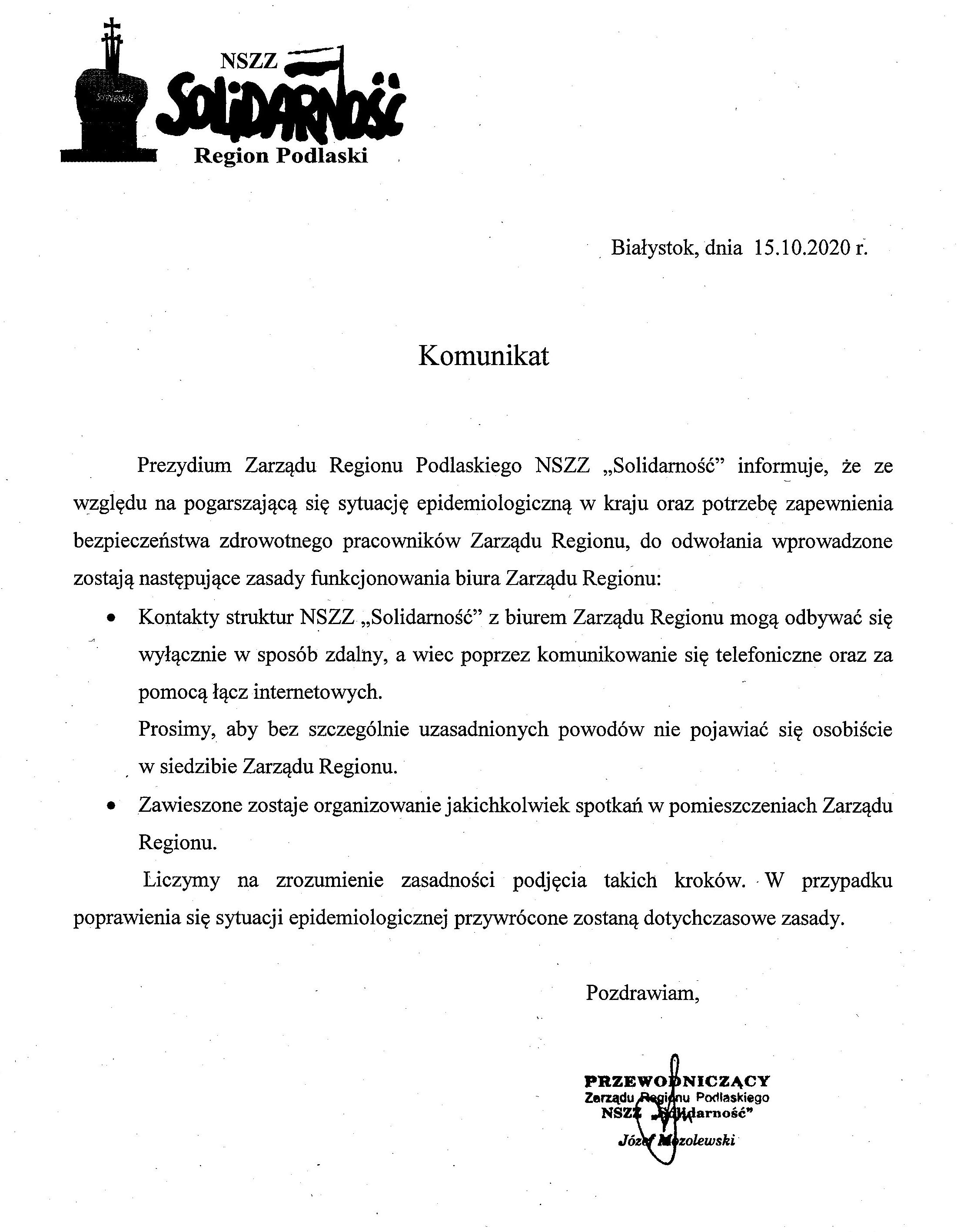Ze  względu na pogarszającą się sytuację w kraju, do odwołania wprowadzone zostają nowe zasady funkcjonowania biura Zarządu Regionu.