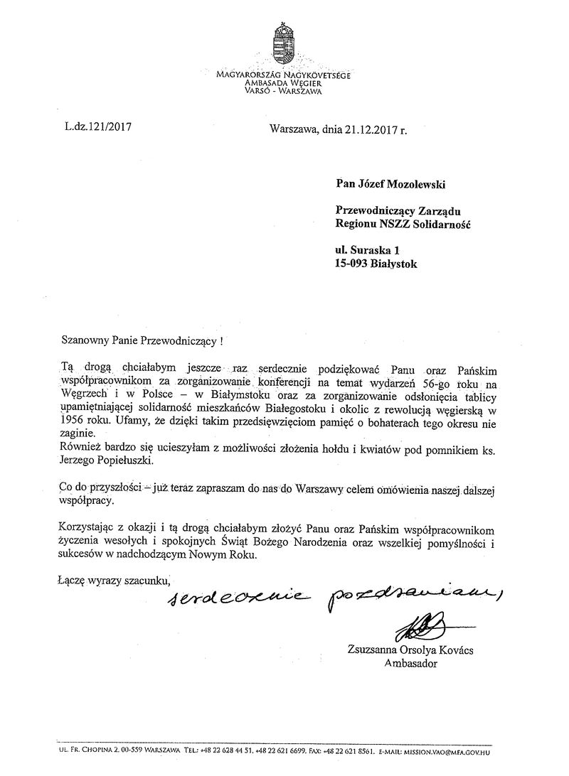 Do Zarządu Regionu Podlaskiego NSZZ "Solidarność" wpłynęły podziekowania i życzenia z Ambasady Węgier. Jest nam bardzo miło być docenionym za nasze zaangażowanie oraz wzorową wspólpracę.
