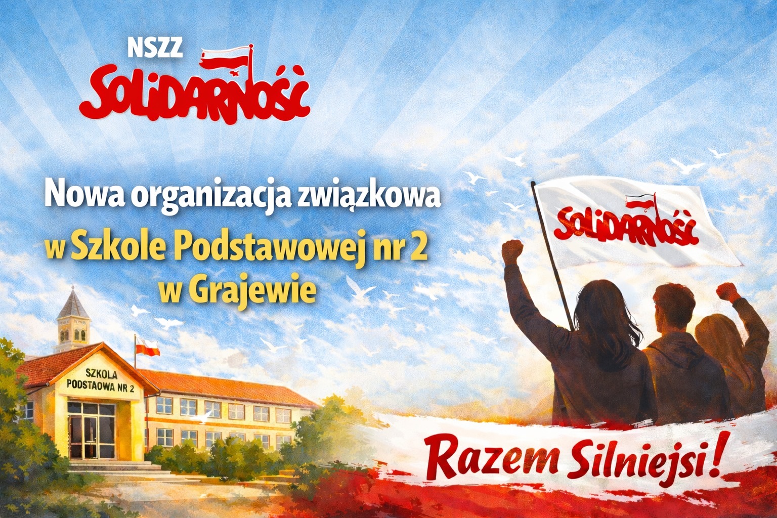 Miło nam poinformować, iż z inicjatywy pracowników Szkoły Podstawowej nr 2 im. Adama Mickiewicza w Grajewie powstała w tej placówce organizacja związkowa NSZZ "Solidarność". Zarząd Regionu Podlaskiego w dn. 1.04.2026 r. podjął decyzję o jej  zarejestrowaniu w Naszych strukturach. W najbliższym czasie odbęda się wybory, podczas których wybrane zostaną władze komisji zakładowej.  Nowa organizacja liczy ok. 40 członków. Raz jeszcze witamy nowych związkowców na Naszym pokładzie!