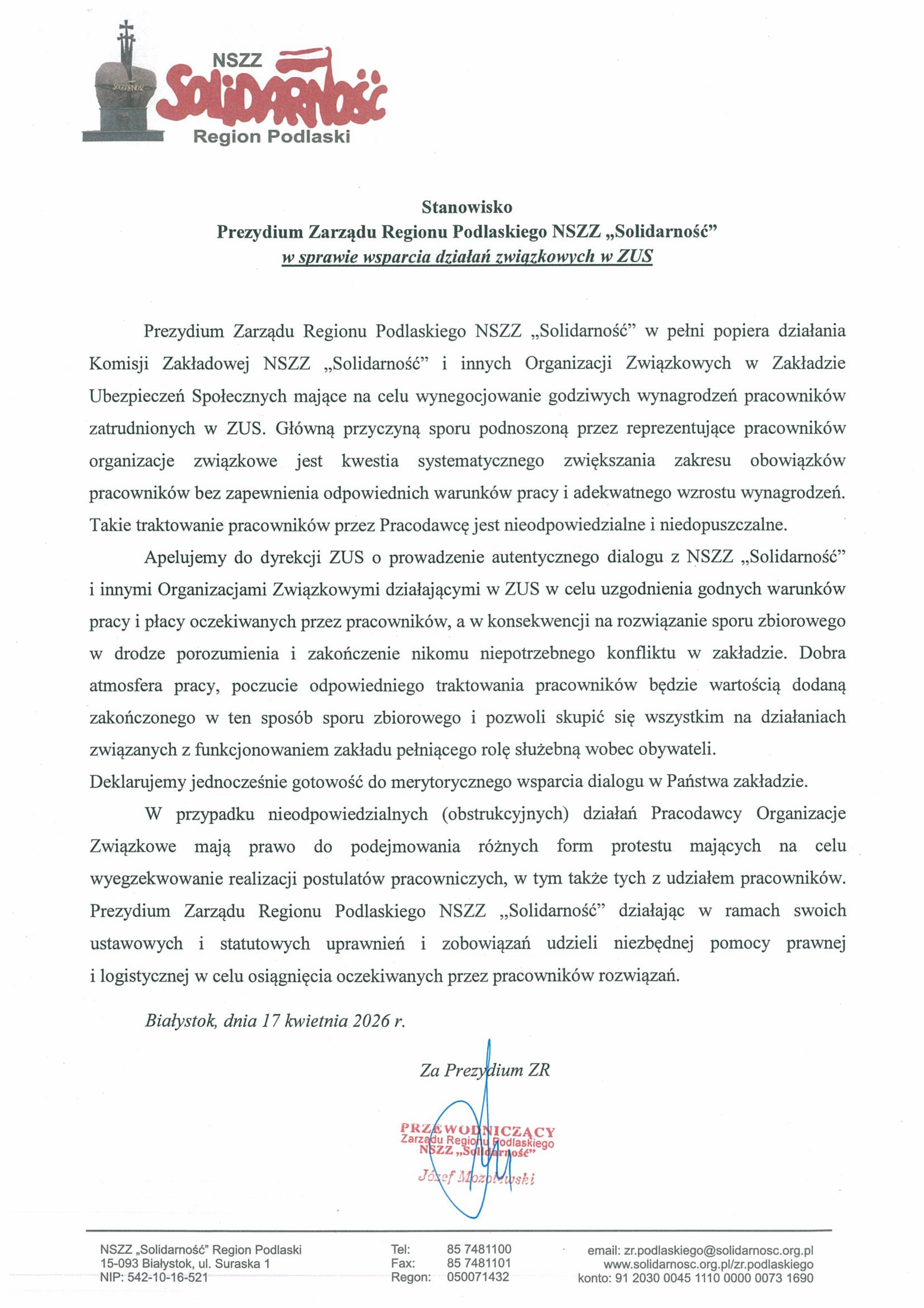 Poniżej stanowisko Prezydium Zarządu Regionu Podlaskiego NSZZ "Solidarność" ws. wsparcia działań związkowych w ZUS.
