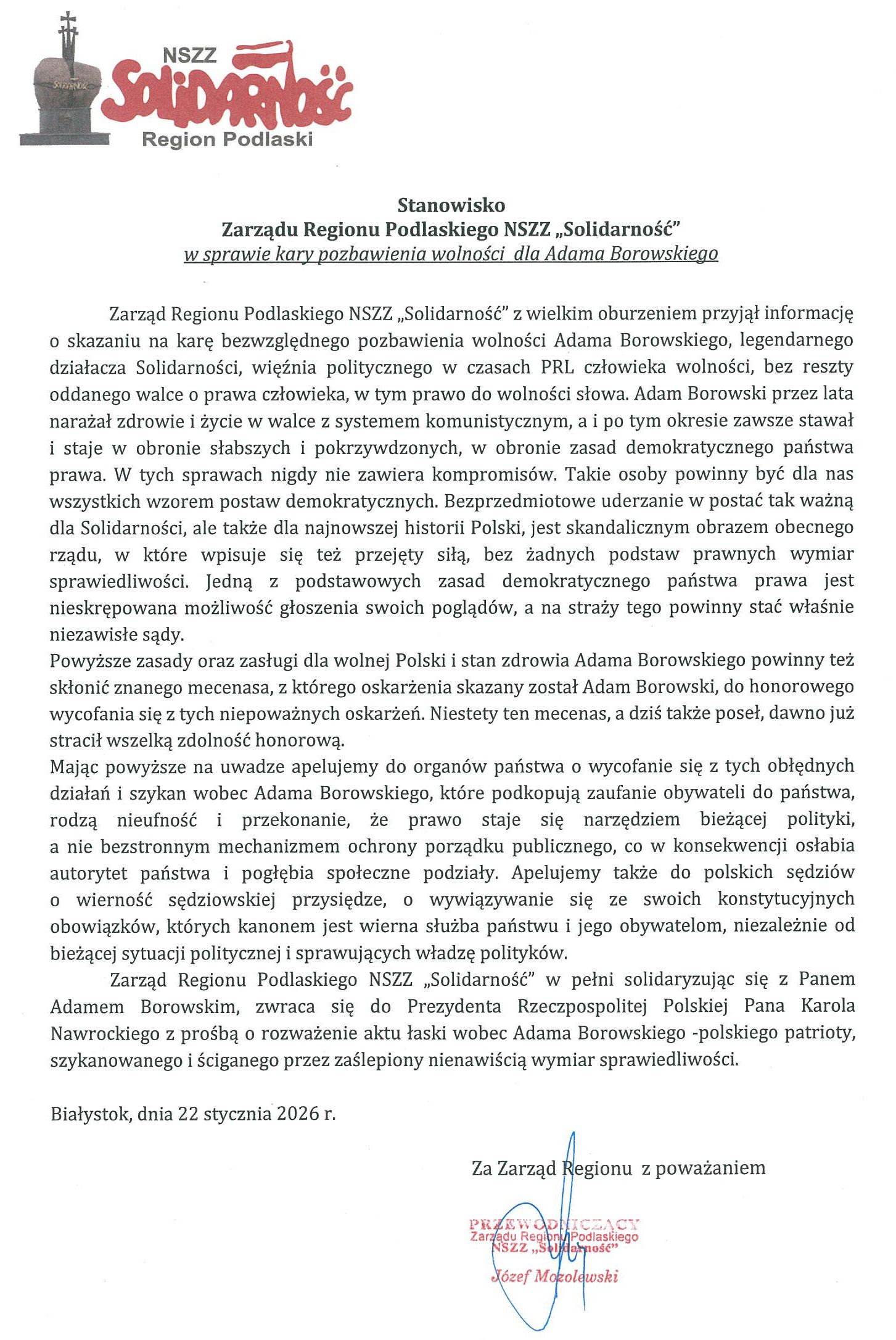 Zarząd Regionu Podlaskiego NSZZ "Solidarność" przyjął stanowisko w sprawie kary pozbawienia wolności dla Adama Borowskiego.